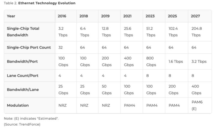 长期以来,NVIDIA 的 InfiniBand 凭借其超低延迟(低于 2 微秒)和零丢包率,在 AI 数据中心的横向扩展市场占据主导地位。然而,随着 UEC 1.0 标准于 2025 年 6 月发布,以太网正努力追赶 InfiniBand 的低延迟和高稳定性,逐步重夺市场竞争力。与此同时,博通持续的研发周期,每两年将交换机 IC 的带宽翻一番,不断提升以太网硬件的性能。