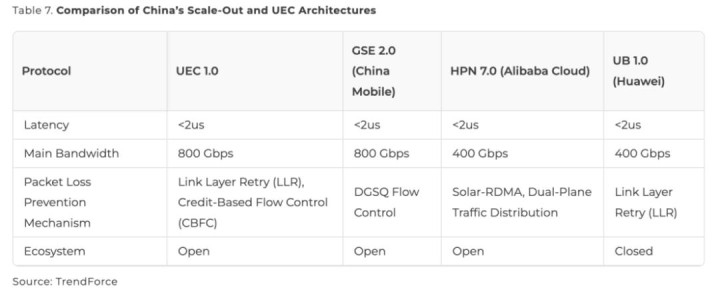阿里巴巴、百度、华为和腾讯等众多科技巨头选择加入UEC,共同推进UEC标准的制定。除了参与标准化工作外,中国企业也在自主研发横向扩展架构,这些架构通常以低延迟和零丢包为目标,并直接与InfiniBand进行对比。
