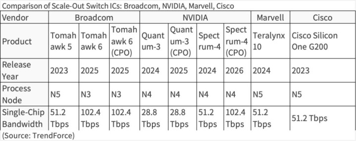 博通在CPO技术领域也处于领先地位。自2022年以来,该公司发布了Tomahawk 4 Humboldt的CPO版本,随后在2024年发布了Tomahawk 5 Bailly,并在2025年继续推出Tomahawk 6 Davisson,巩固了其在以太网硬件集成领域的领先地位。